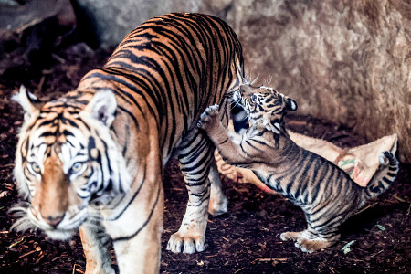 17日、ドイツの首都ベルリンの動物園で、母親にじゃれつく生後2カ月のスマトラトラの赤ちゃん。名前の公募が行われ、1000を超える候補から「リリー」と名付けられた。 【EPA時事】