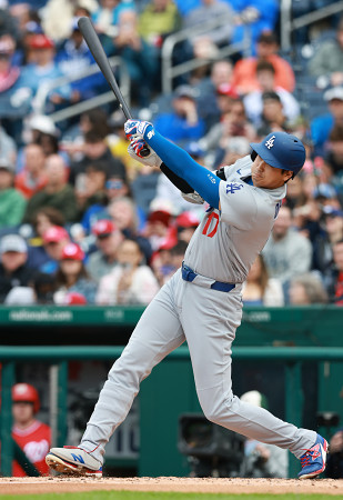 米大リーグ。ドジャースの大谷はナショナルズ戦に1番指名打者で出場し、3回に先制の2号ソロを放った。8回には勝ち越しの犠飛を打ち、4打数2安打2打点。チームは8―6で勝って3連勝=5日、ワシントン 【時事通信社】