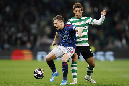 サッカーの欧州チャンピオンズリーグで7日、スポルティングの守田英正(右)がアーセナルとの準々決勝第1戦にフル出場した。終了間際の失点でチームが0―1で敗れた中、役割を果たした=ロンドン 【AFP時事】