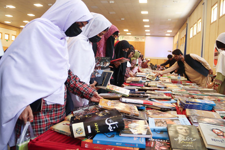 23日、パキスタン・クエッタで、本を手に取る人々。4月23日は、ユネスコが制定した「世界図書・著作権デー」。このように実際に触れれば、デジタル時代にあって、読者の「本離れ」を食い止める一助となるかも。 【EPA時事】