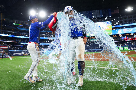 ブルージェイズの岡本はガーディアンズ戦に4番三塁で出て、4回に2試合連続本塁打となる5号ソロを放つなど3打数2安打2打点。チームは5―3で勝った。写真は試合後に祝福される岡本(右)=25日、トロント 【AFP時事】