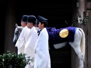 氏子たちが軽く頭を垂れると、巫女が湯に浸したクマザサを勢いよく振り、水滴が白い湯気と共に弧を描いて参拝者たちの頭上に降り掛かった。思わず「あちぃ」と声を出す人の姿もあった。