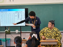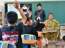 志摩ノ海関は「子どもの頃は真珠いかだを泳いで渡ったりしながら、外で遊ぶことがほとんどだった。故郷は自然豊かで人が親切で心が癒やされる場所。地元の飲食店『白楽天』(志摩町)によく行った」と話すと、子どもたちから「どれだけのご飯を食べますか」と質問され、「ラーメンの丼なら山盛りで3杯、回転ずしなら100皿は楽勝」と答えると、教室がどよめいた。