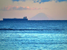 写真は、その水平線に浮かぶ富士山の前を大型貨物船が横切った瞬間に写したもの。まるで貨物船が富士山を運んでいるように見えた。