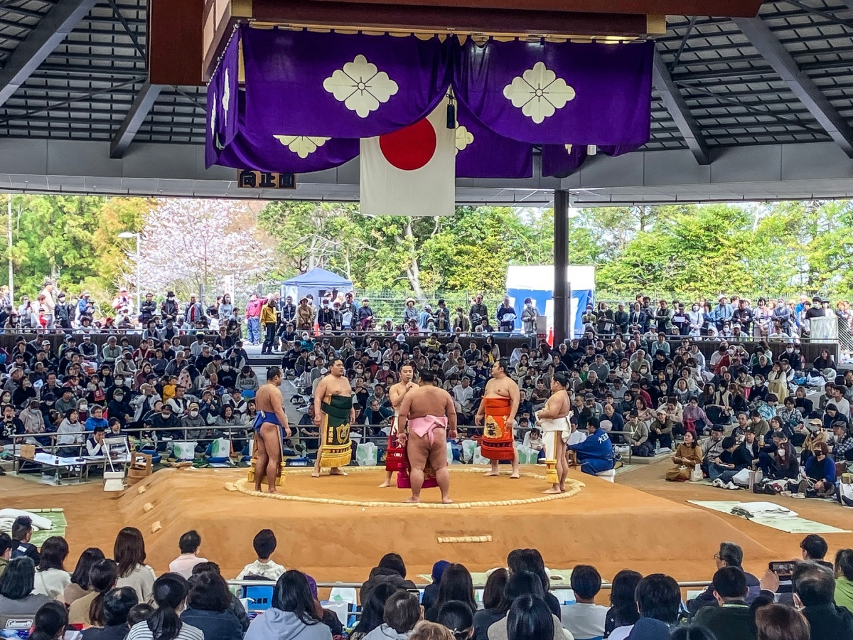 桜咲く神宮相撲場で恒例の伊勢神宮奉納大相撲