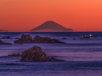 日本国内で唯一、富士山が宙に浮き上がっているように見える「浮富士(うきふじ)」が12月18日早朝、鳥羽市と志摩市の海岸そば、海抜0メートルに近い地点で観測された。