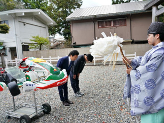 猿田彦神社(伊勢市宇治浦田)の境内にある車両修祓(しゅばつ)所で4月7日、神職がまだコースを一度も走ったことがない新車のレーシングカートをはらい清め、交通安全を祈願した。