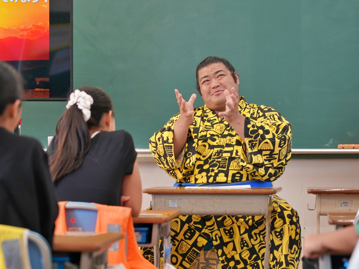 志摩市出身の現役力士の志摩ノ海関が10月2日、出身地にある志摩小学校(志摩市志摩町)で特別授業を行った。
