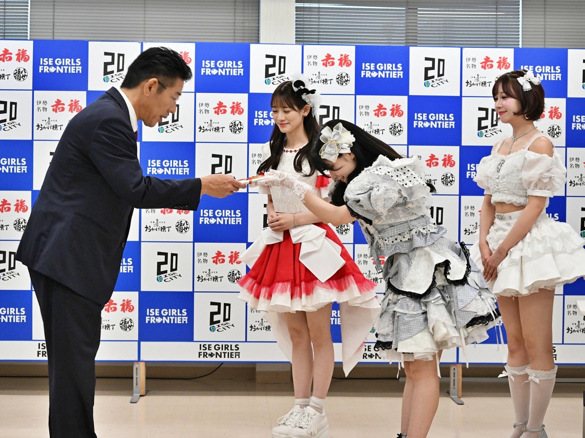 伊勢市内で11月29日・30日に開かれるガールズフェスティバル「ISE GIRLS FRONTIER 2025」に参加するアイドルらが10月10日、伊勢市役所で開催発表会を開き、鈴木健一伊勢市長に周辺地域の小中学生への招待券を贈呈した。
