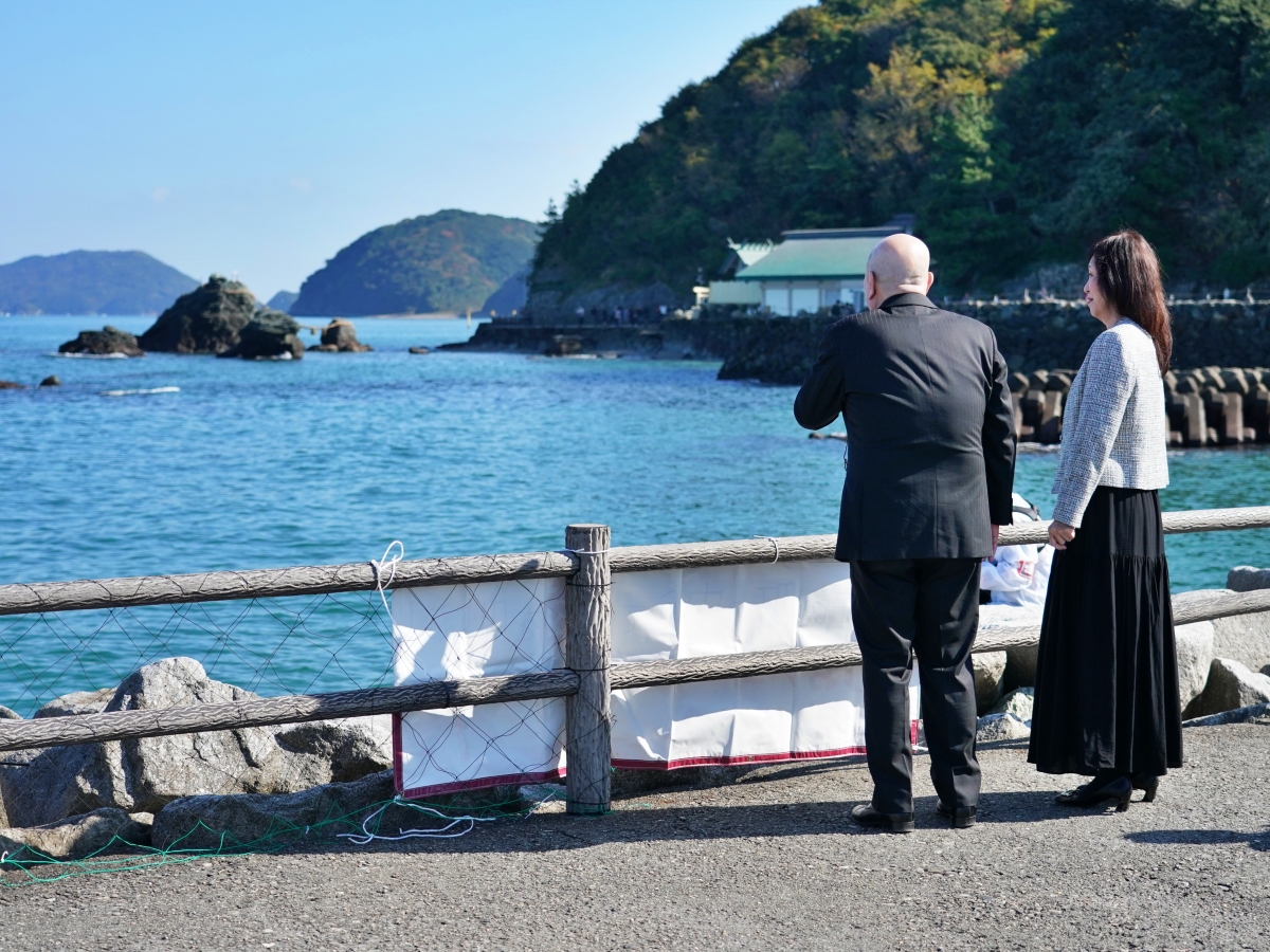 伊勢二見・夫婦岩に向かって愛を叫ぶ「めおチュー」