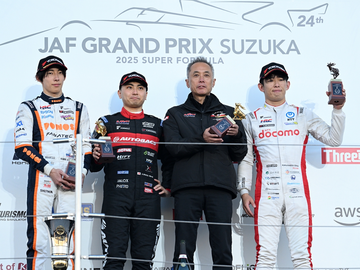 伊勢出身・三宅淳詞選手、スーパーフォーミュラ鈴鹿最終戦は16位(撮影=秋山昌輝)Super Formula 第12戦の表彰式。左から2位の佐藤連選手、優勝した岩佐歩夢選手、優勝チームの田中洋克監督、3位の太田格之進選手  →次の写真  関連記事 記事URL: https://iseshima.keizai.biz/headline/4329/