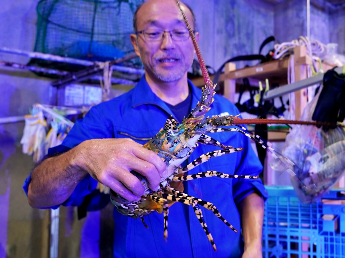 志摩・英虞湾で取れた巨大「ニシキエビ」 鳥羽水族館のバックヤードで待機する