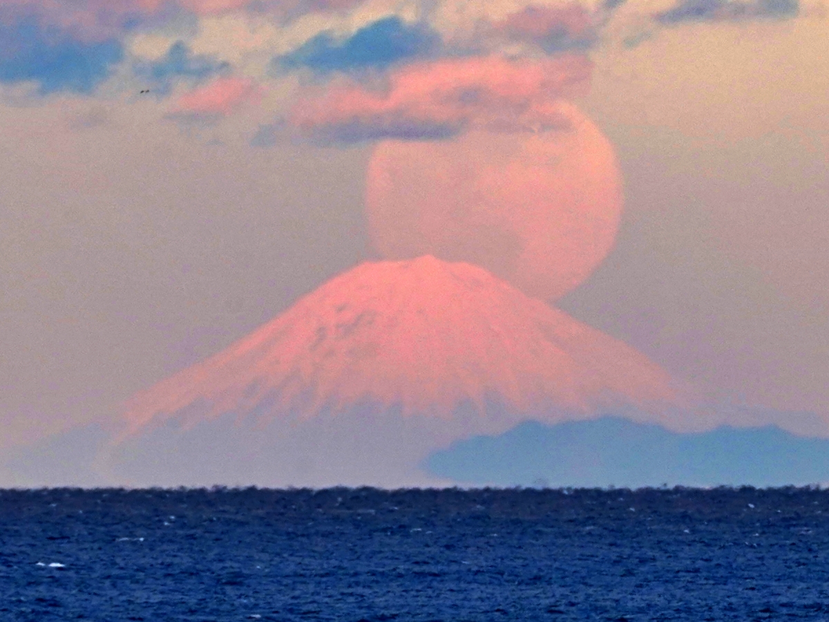 1月3日16時34分ごろ、鳥羽市国崎町の鎧崎(よろいざき)から今年最初の満月が富士山の頂上から現れた。