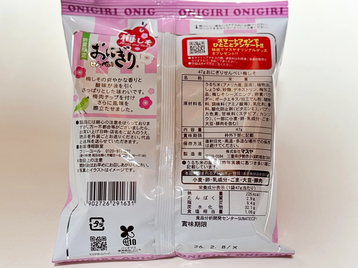 伊勢市内に製造工場を持つ菓子メーカー「マスヤ」(伊勢市小俣町)が1月19日、和歌山県産南高梅の梅肉チップを振りかけた季節限定の「おにぎりせんべい 梅しそ」を発売した。