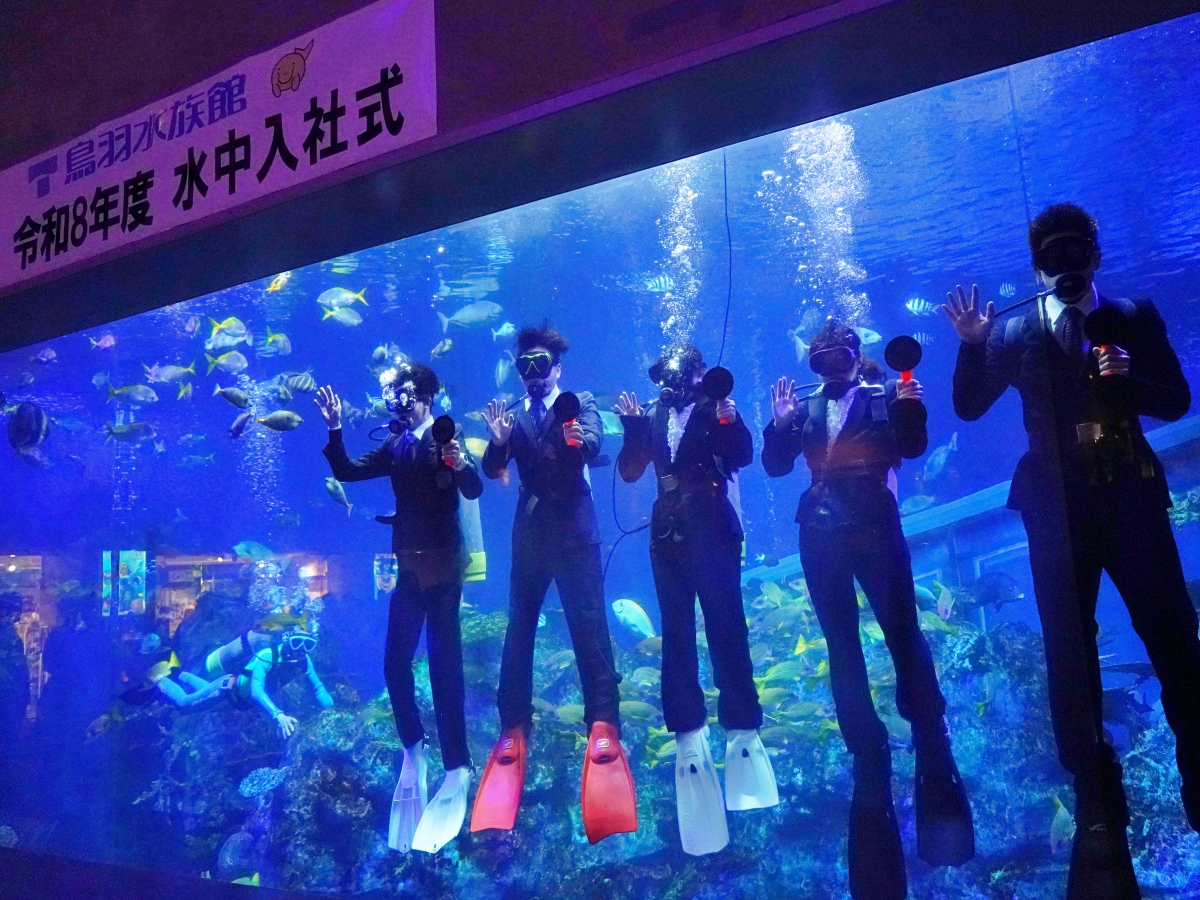 鳥羽水族館(鳥羽市鳥羽)恒例の水中入社式が3月31日、エントランスホール正面の巨大水槽の中で行われ、新入社員5人が臨んだ。