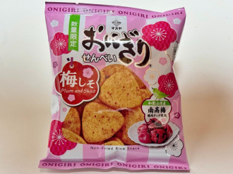 伊勢市内に製造工場を持つ菓子メーカー「マスヤ」(伊勢市小俣町)が1月19日、和歌山県産南高梅の梅肉チップを振りかけた季節限定の「おにぎりせんべい 梅しそ」を発売した。
