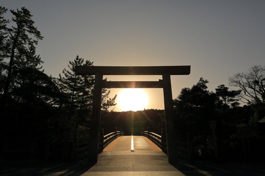 宇治橋の入口に立つ大鳥居越しの向こうに昇る初日の出 写真提供:神宮司庁