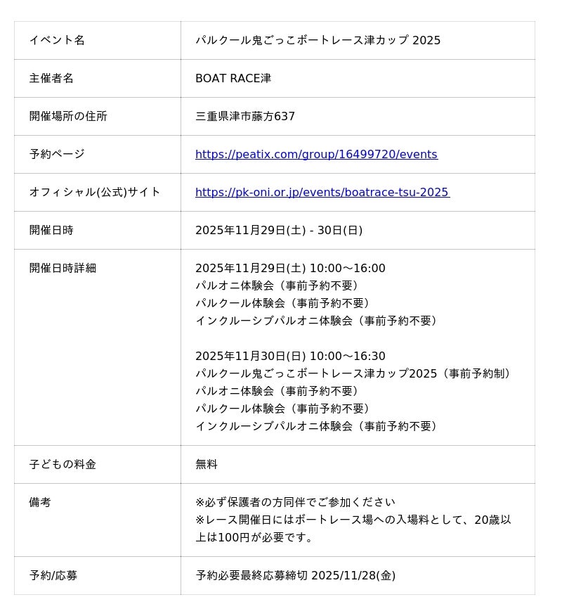 BOAT RACE津で開催される「パルクール鬼ごっこボートレース津カップ2025 」では、「あそびがカラダを作る!」をテーマに、パルクール鬼ごっこで楽しさとともに能力を向上させる、小学生以下及びその保護者を対象とした限定のイベントを11月29日(土)・30日(日)で2日間に渡り開催!