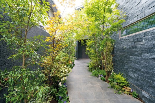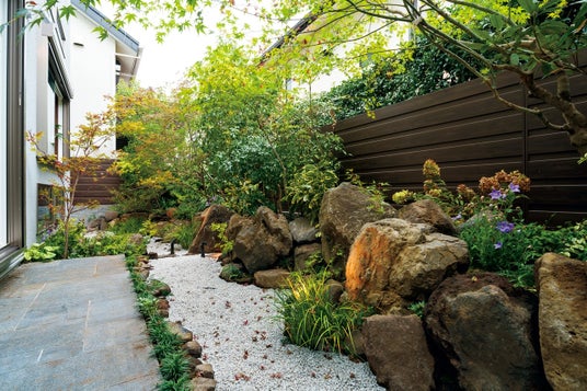 本邸宅では、敷地内外の緑視率を高める庭園と室内緑化を担当。四季を感じる植栽や自然素材を用い、自然と心が整う空間を創出しました。