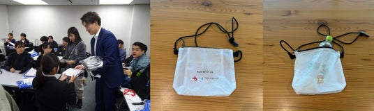 サコッシュを学連のスタッフに配布する様子、寄贈したサコッシュ