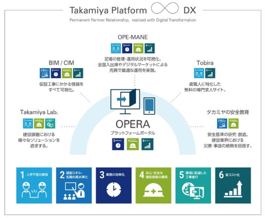 また、建設業の深刻な人手不足・コスト高などの問題に対応するため、建設ソリューション群「タカミヤプラットフォーム」を提供しています。足場等の仮設機材の調達・運用マーケットプレイス提供やデジタル設計支援等のデジタル化にはじまり、各種安全教育サービスまで、多岐にわたるソリューションを統合しています。