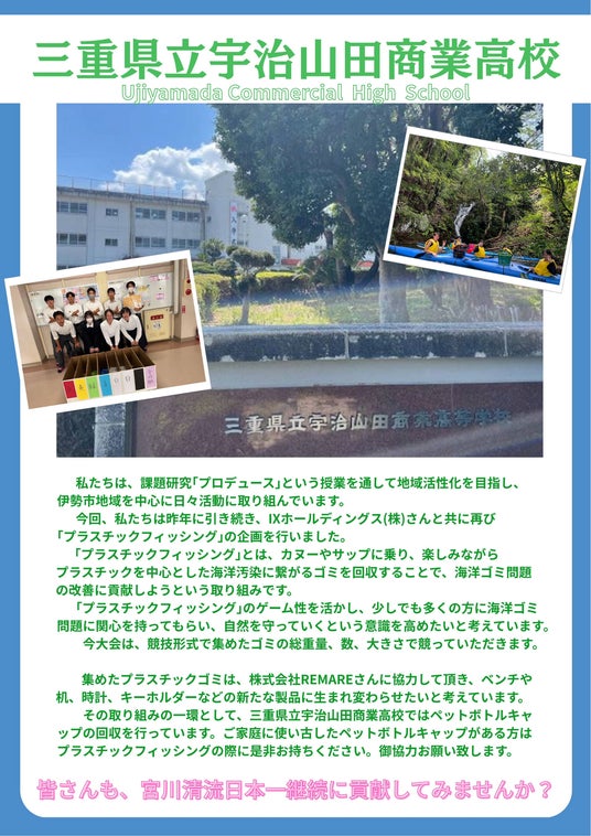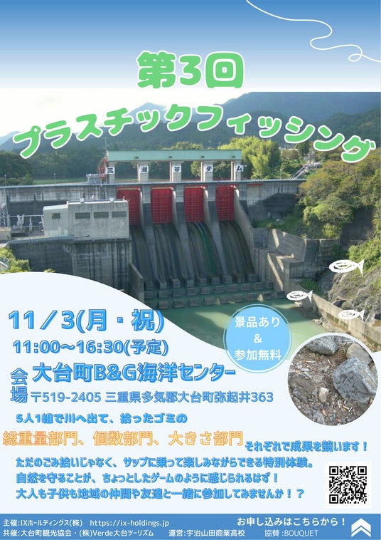 IXホールディングス株式会社(本社:三重県伊勢市 代表取締役社長 浜田吉司)は、三重県立宇治山田商業高等学校(以下、宇治山田商業)生徒の運営のもと2025年11月3日(月・祝)に「2025プラスチックフィッシングin三瀬谷ダム」を大台町B&G海洋センターにて開催します。