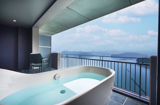 扉を開けた瞬間、目の前に広がる恵みに満ちた伊勢湾。その穏やかな海と同化するように広がる青。海と空の境目がゆるやかに溶けあう、露天風呂付きの青の客室。湯に身をゆだねれば、潮風が頬をなで、ただそれだけで日常は遠く離れていきます。