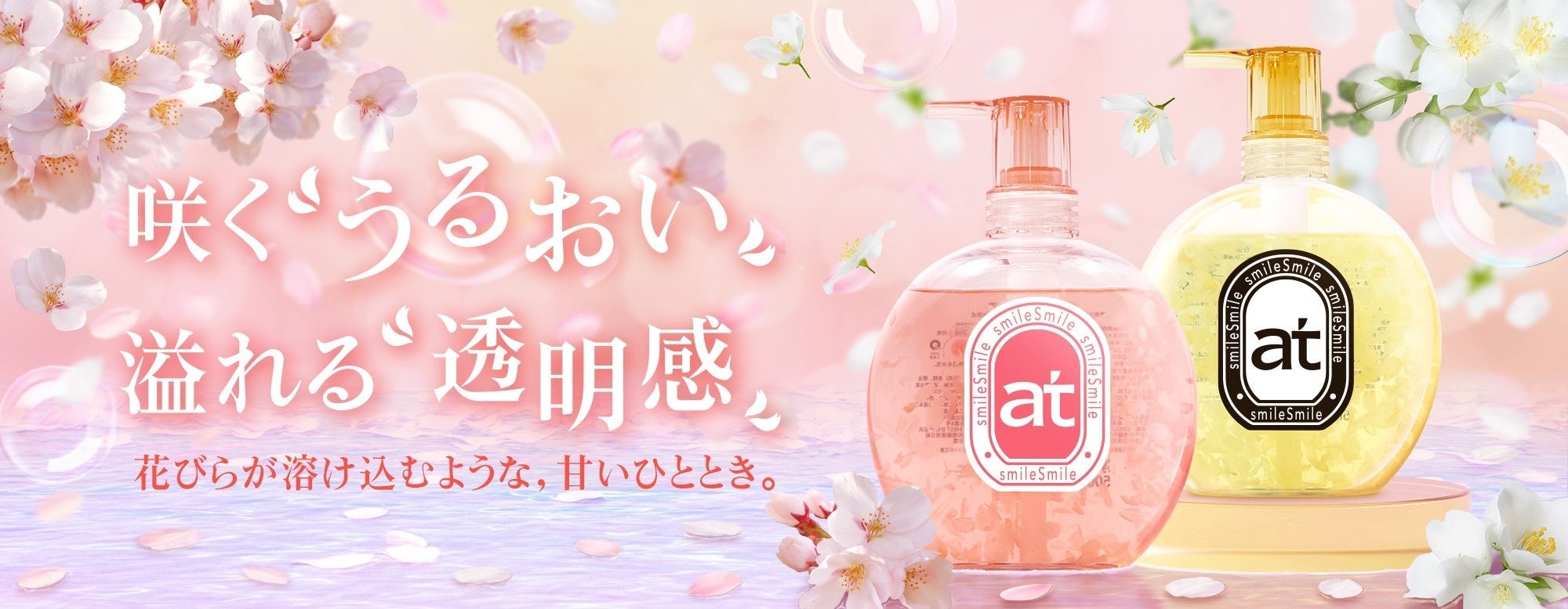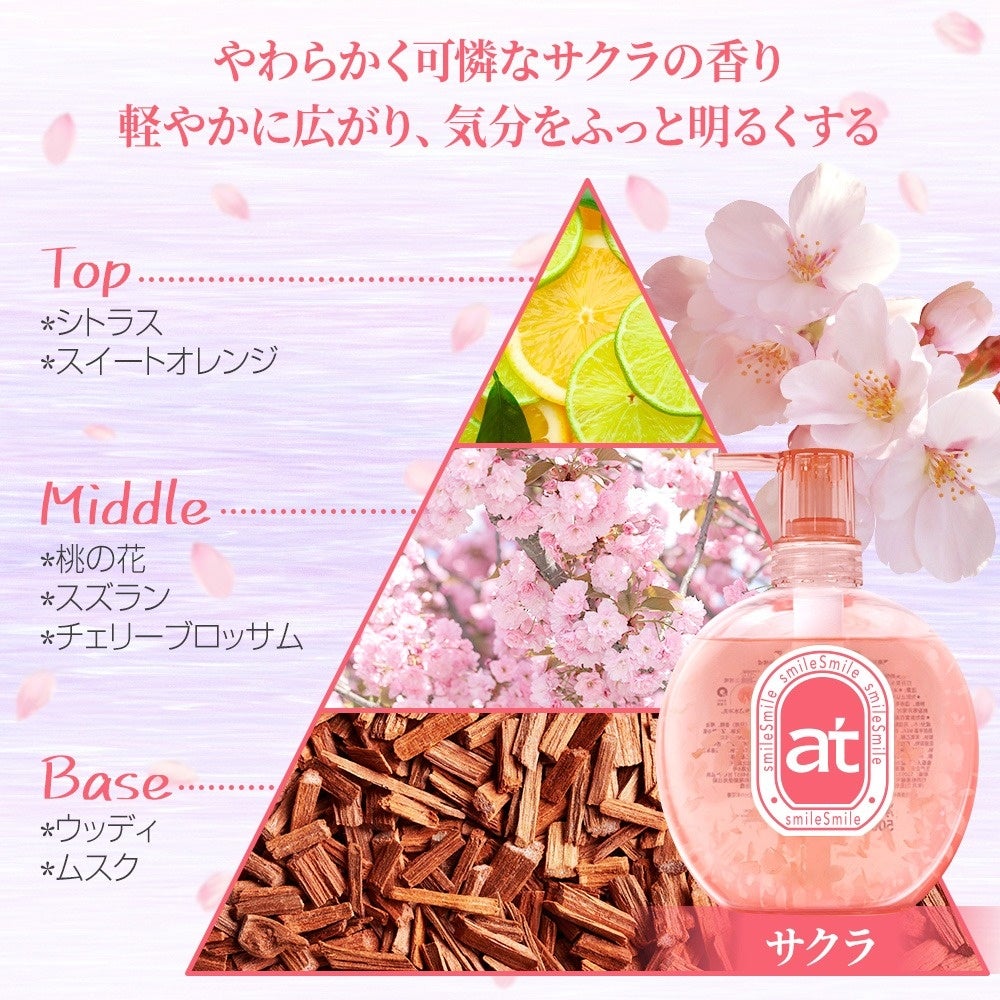王子製薬株式会社(東京営業所:東京都渋谷区)は、「at」 ブランドから、サクラとジャスミンのハンド&ボディウォッシュの2種類を、2026年2月18日(水)より各ECで新発売いたします。本製品は、見た目・香り・うるおいケアの3つを同時に満たすアイテムです。透明なボトルの中で咲く本物の花びらが、日常のバスタイムを特別なひとときへと導きます。