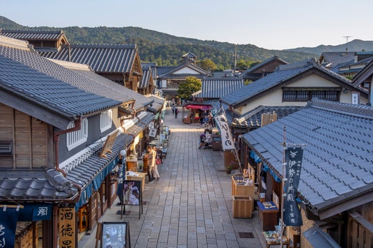 伊勢神宮内宮前に位置するおかげ横丁は、1993年に誕生した町並みで、50余りの店が軒を連ねています。江戸から明治にかけての伊勢路の風情を再現し、伊勢の食文化や伝統工芸、歴史を体感できる場として、多くの参拝客を迎えています。季節ごとの催しや、伊勢路を感じさせる建物や風景、厳選された特産品や土産、郷土料理などが楽しめます。また、紙芝居の口演や神恩太鼓の演奏といった催しも行われ、年間約500万人の観光客が訪れます。