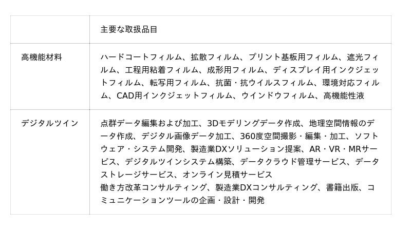 事業内容: 各種素材を活かした高機能材料製品の開発・生産・販売