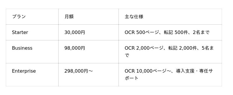 OCR精度は手書き文字を含む日本語PDFで高い認識率を実現しており、FAXで送られてきた発注書であっても読み取りが可能です。表記ゆれの自動正規化機能を搭載しているため、「(株)」と「株式会社」、全角数字と半角数字といった差異を自動的に同一と判定します。